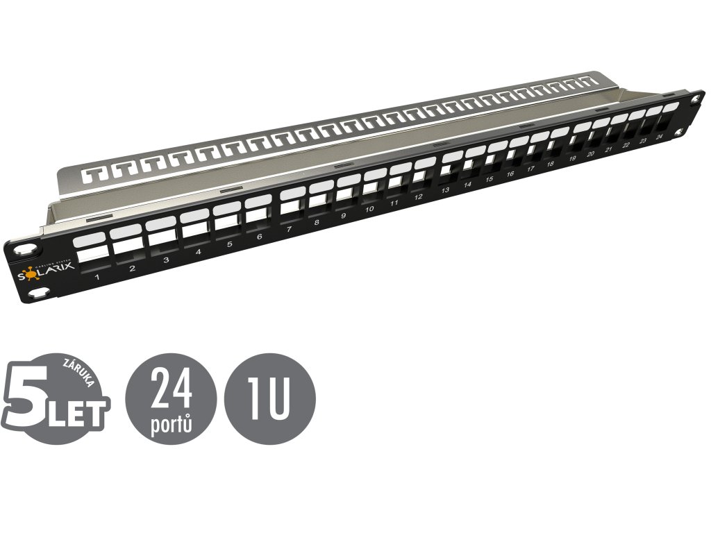Patch panel Solarix s označením SX24M-0-STP-BK-UNI-N je univerzální neosazený patch panel, který je určený pro 24 stíněných i nestíněných keystonů Solarix SXKJ-xx-yyy-BK-SA a SXKJ-xx-yyy-BK-NA. Modulární provedení patch panelu umožňuje pohodlnou instalaci a díky vyvazovací liště, která je součástí dodávky panelu, i přehledné vyvázání a pevné uchycení datového kabelu přímo k tělu panelu. Tento patch panel je vybaven zemnícím drátem, který umožňuje jeho propojení se zemněním rozvaděče. Barva patch panelu je černá, vyvazovací lišty stříbrná, velikost v datovém rozvaděči je 1U. V případě potřeby je možné zaslepit volné porty panelu záslepkou SXKJ-0-BK. Rozměry otvorů pro keystone jsou u tohoto modulárního panelu Solarix 19,5±0,1 mm x 14,8±0,1mm (tj. dle ČSN EN 60603-7). Součástí balení je 4x M6 montážní sada, 24x vyvazovací pásek a 1x zemnící drát. Tento patch panel má čelo vyrobeno z vysokopevnostního plastu, které je nalisováno na kovovou kostru panelu.Technické parametry