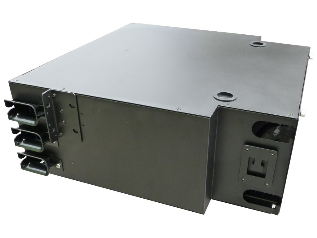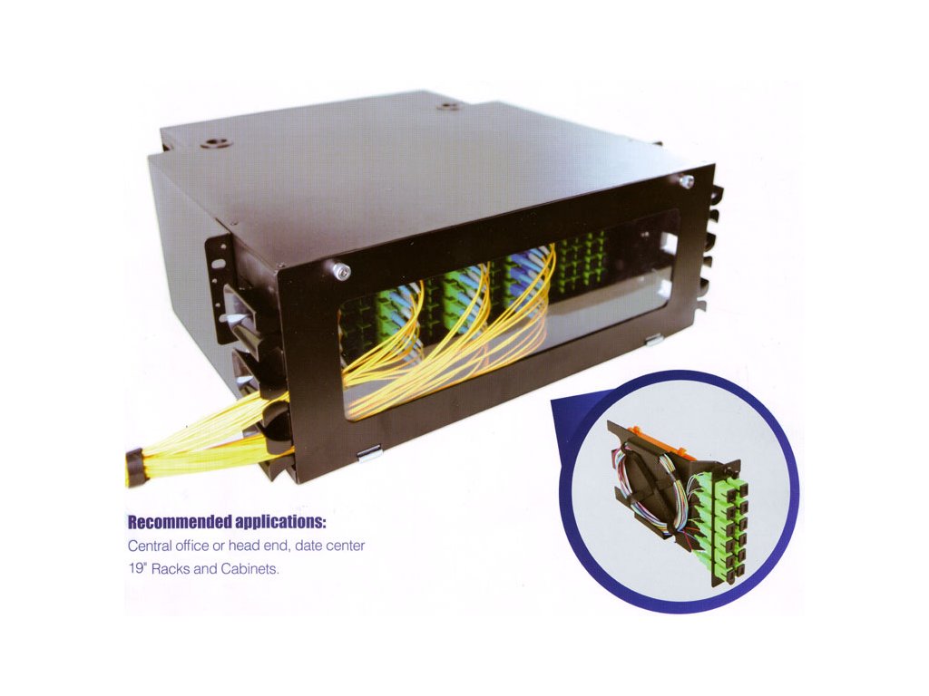 Optická vana 4U pro 144 spojek (až 288 vláken při použití LC komponentů) do datových center, kde je potřeba na malém místě ukončit desítky vláken.