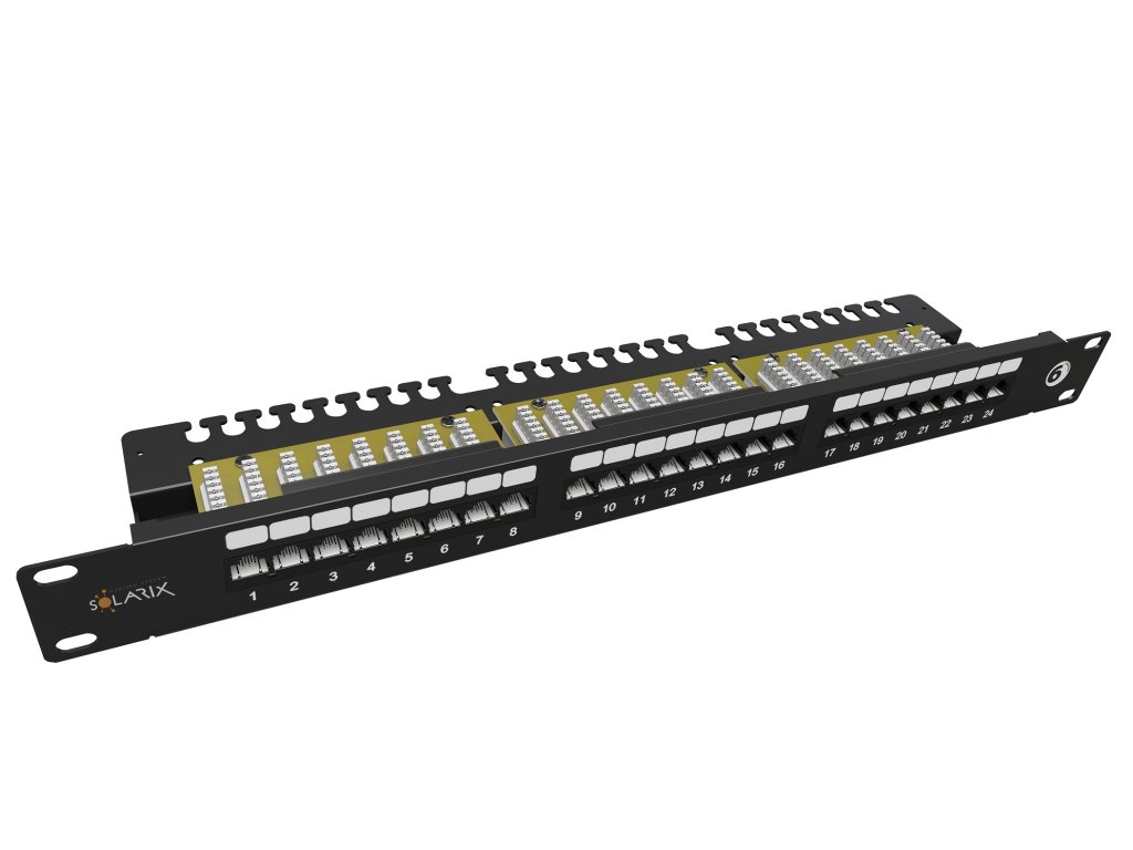 Patch panel Solarix SX24L-6-UTP-BK-N je 19“ nestíněný panel kategorie 6 osazený 24 porty RJ45. Součástí těla tohoto panelu je vyvazovací lišta, která slouží k pevnému uchycení kabelů. Instalační kabel se na tomto panelu zakončuje do duální IDC svorkovnice typu 110/Krone – tj. k zařezání lze použít nástroj typu 110 i Krone. Svorkovnice panelu je označena podle standardu T568A i T568B. Stejně jako všechny ostatní komponenty strukturované kabeláže Solarix je i tento panel vyroben tak, aby poskytoval velmi dobrou funkčnost a vysokou spolehlivost. Tento patch panel splňuje požadavky na komponenty kategorie 6 a třídy vedení Class E, které jsou definovány ve standardech ANSI/TIA 568, ISO/IEC 11801 a EN 50173, a to včetně všech nejnovějších dodatků. Barva patch panelu je černá; velikost v datovém rozvaděči je 1U. Součástí balení je 4 x M6 montážní sada, a 24 x vyvazovací pásek. Tento nový patch panel Solarix nahrazuje panel s označením SX24L-6-UTP-BK.Technické parametry