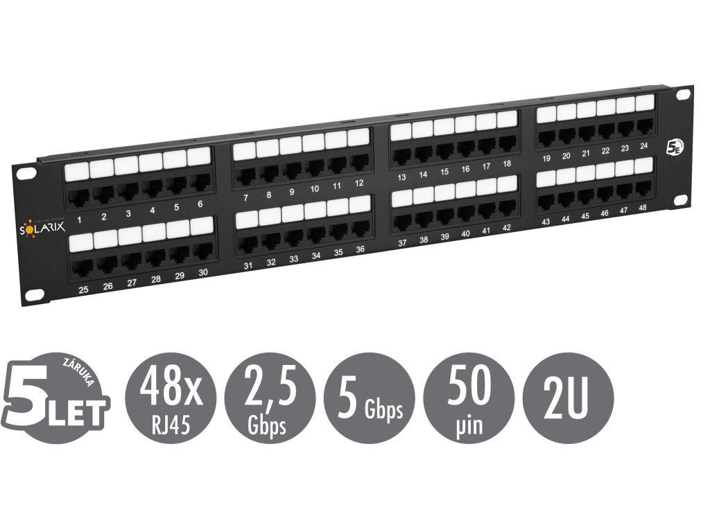 Nestíněné patch panely produktové řady Solarix – kategorie 5E jsou dodávány v provedení 12, 24 a 48 portů RJ45 a jsou osazeny moduly s duální IDC svorkovnicí typu 110/Krone. Každý kontakt je na této svorkovnici z důvodu snadného zakončení kabelu označen barvami podle typu zapojení, a to buď podle standardu T568A, nebo T568B. Tyto komponenty strukturované kabeláže Solarix jsou vyrobeny tak, aby zaručovaly dlouhou životnost, vynikající funkčnost a především spolehlivost. Nestíněné patch panely Solarix – kategorie 5E jsou testovány až do šířky pásma 150 MHz a převyšují tak požadavky na komponenty kategorie 5E/Class D definované v mezinárodních normách ANSI/TIA 568, ISO/IEC 11801 a EN 50173, včetně všech nejnovějších dodatků. Standardní barva patch panelů je černá. Velikost v datovém rozvaděči je 2U.Technické parametry