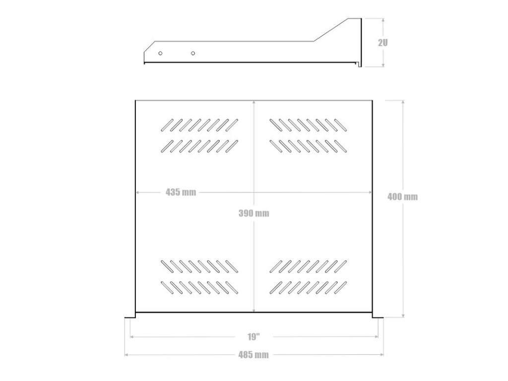 Polička s perforací 19" 2U 400 mm - 19" nízkoprofilová police 400 mm s uchycením 2U je vhodná pro umístění do 19" datového rozvaděče s hloubkou 600 mm a hlubšší. - Perforované tělo police umožňuje proudění vzduchu. - Tato police se instaluje pouze na přední vertikální lišty datového rozvaděče. TECHNICKÉ VLASTNOSTI Celková hloubka police: 400 mm Výška uchycení v rozvaděči:: 2U Rozměr úložné plochy police: (š) 435 mm x (h) 390 mm Max. nosnost police: 30 kg Rozměry: (v) 100 mm x (š) 510 mm x (h) 420 mm Hmotnost: 2,32kg Součástí balení je příbal pro uchycení v rozvaděči: 4x klecová matice M6, 4x šroub M6Dodatočné parametre