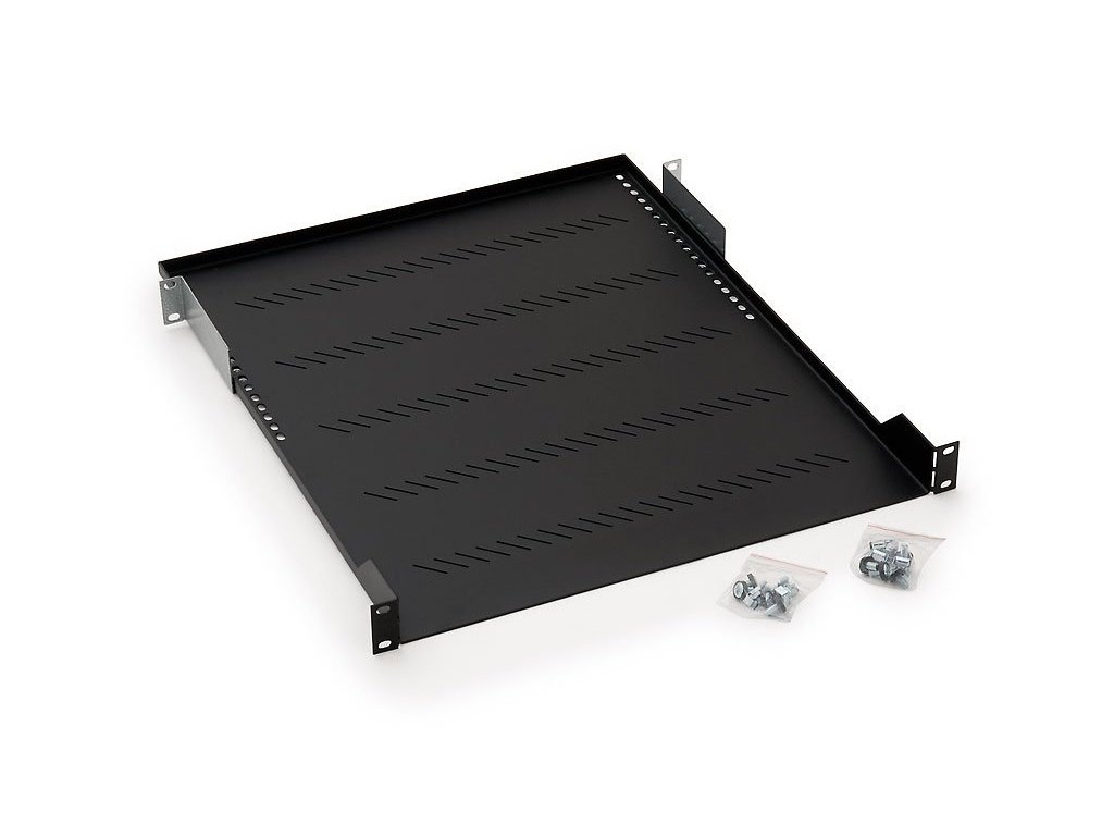 19" polička perforovaná 1U/850mm, max.nosnost 150kg,integrované podpěryČerná barva