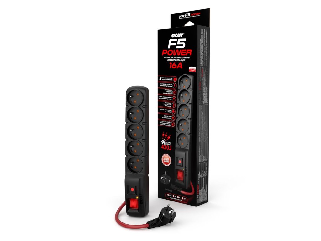 Acar F5 je výkonný prodlužovací přívod s přepěťovou ochranou pro proud až 16A z produktové řady Acar. S délkou menší než 33 cm dává k dispozici 5 zásuvek s uzemněním. Umožňuje napájení až 16A a přepěťovou ochranu*5 zásuvek s ochranným kolíkem