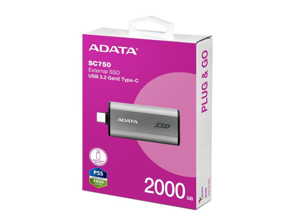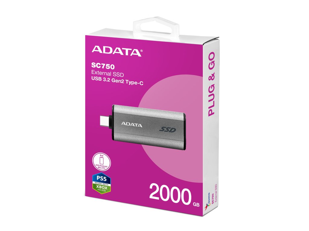Externí SSD disk/USB flash SC750SC750 podporuje rozhraní USB 3.2 Gen2 s rychlostí čtení/zápisu až 1050/1000 MB/s. Je kompaktní a nevyžaduje žádné další datové kabely = funguje jako běžná USB flash. Vysuňte jeho konektor typu C a začněte okamžitě přenášet velké soubory pro práci nebo cestování.