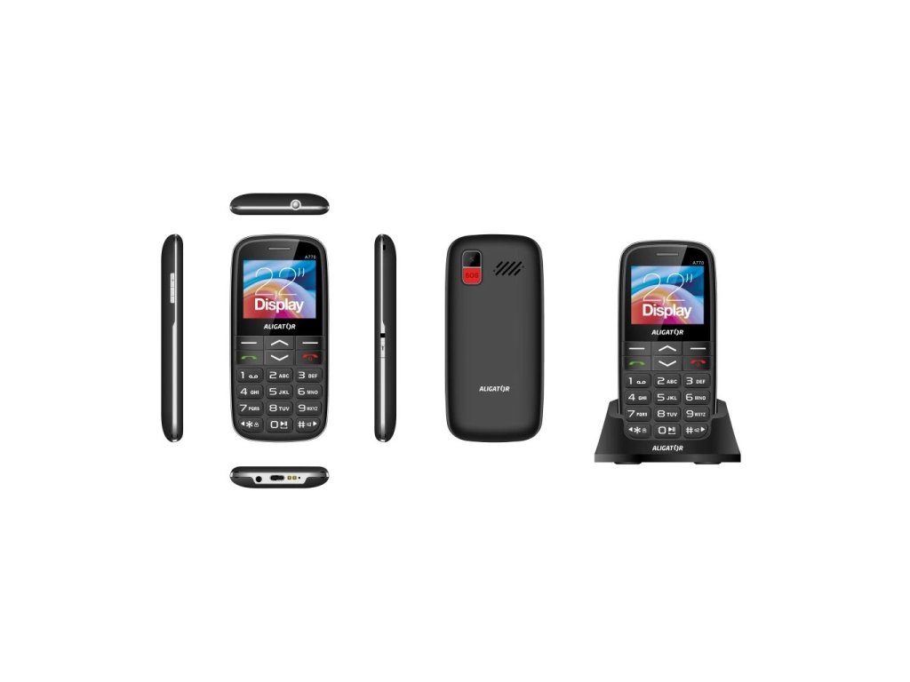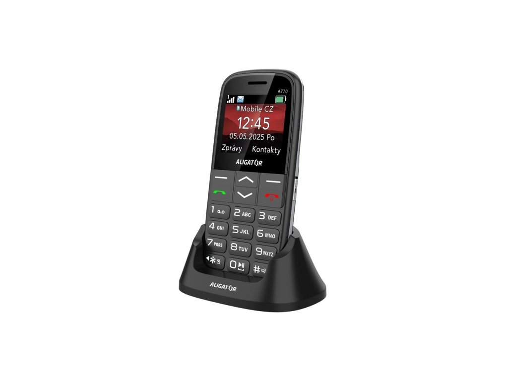 Obsah balení: Telefon Aligator A770, nabíjecí stojánek, návod k použití (bez nabíječky)