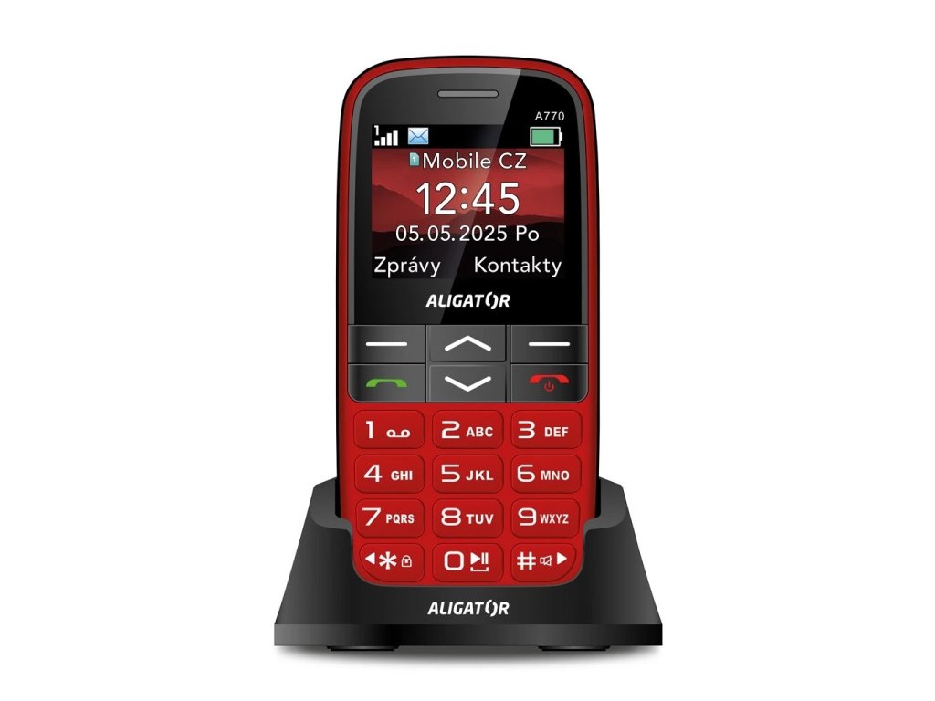 Obsah balení: Telefon Aligator A770, nabíjecí stojánek, návod k použití (bez nabíječky)