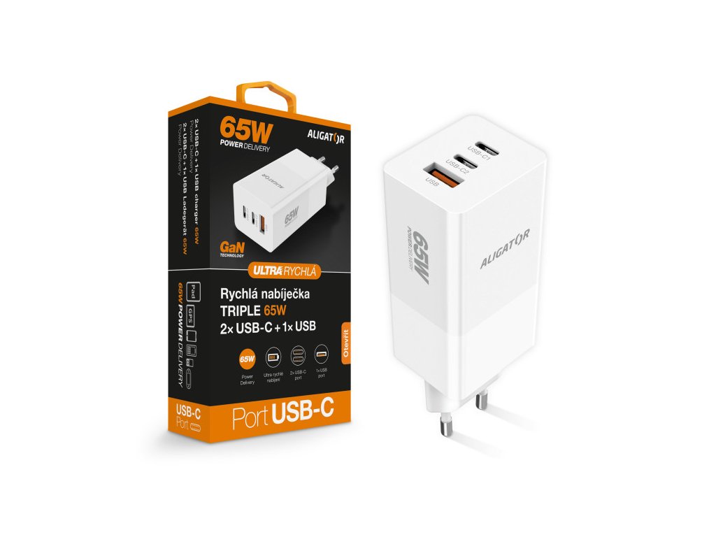 Aligator nabíječka PD65W, 2USB-C, 1xUSB-A, bílá