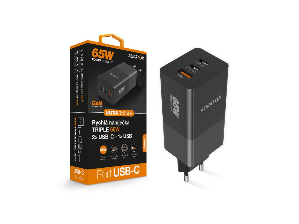 Aligator nabíječka PD65W, 2USB-C, 1xUSB-A, černá