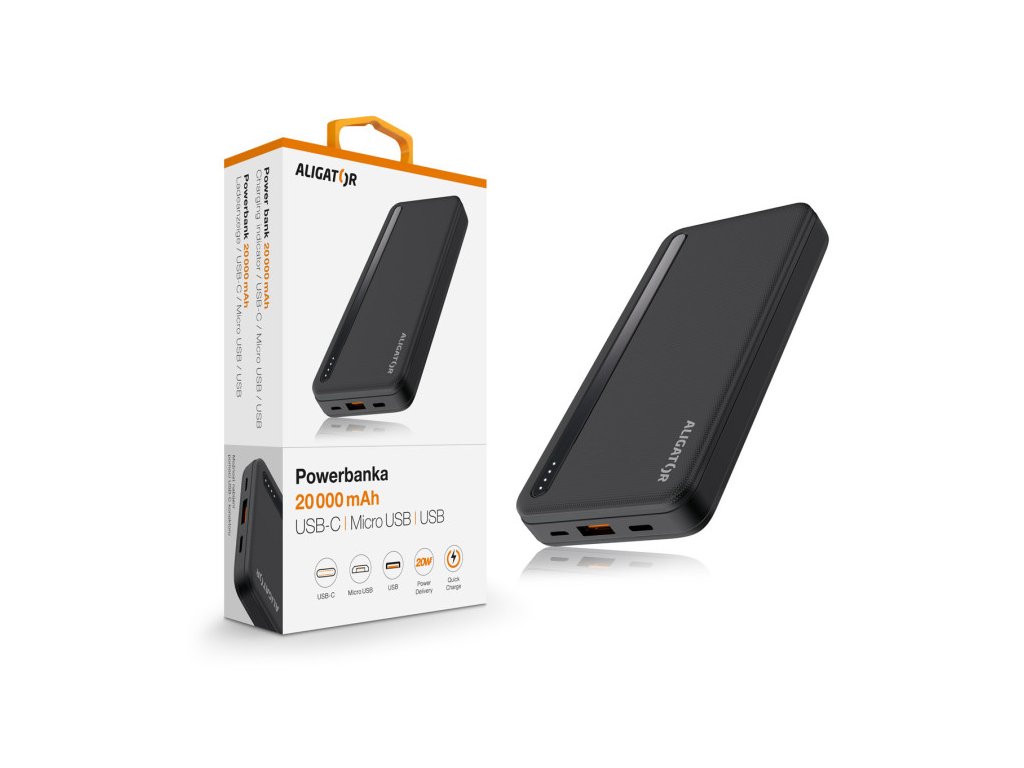 Powerbanka ALIGATOR PBAL2050, Power Delivery 20W, 20 000mAhPowerbanka s?úžasnou kapacitou 20?000mAh, která umí bleskurychle dobít Vaše zařízení až 20W díky podpoře protokolu Power Delivery a také až 18W díky podpoře Quick Charge 3.0 na výstupu USB portu.