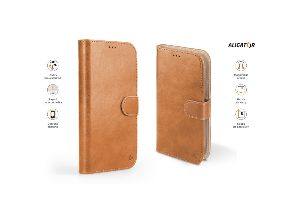 Nová řada univerzálních pouzder značky ALIGATOR.Dokonale propracovaný design, tenké provedení, přihrádka na kartu nebo vizitky, podélná kapsa na bankovky, zavírání pomocí magnetické přezky, snadné uchycení mobilního telefonu pomocí prémiové lepicí nano podložky, která je určena pro opakované umístění telefonu.