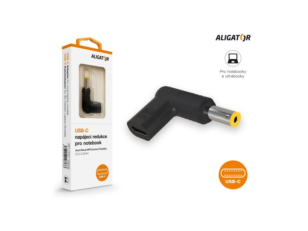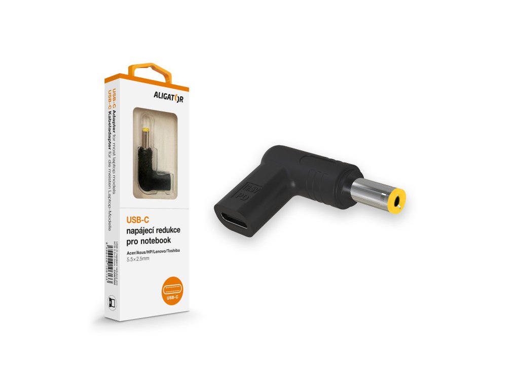 USB-C napájecí redukce 5,5x2,5 mm pro notebooky Acer/Asus/HP/Lenovo/ToshibaUSB-C napájecí redukce 5,5 x 2,5 mm pro notebooky Acer, Asus, HP, Lenovo a Toshiba řady ALIGATOR POWER.