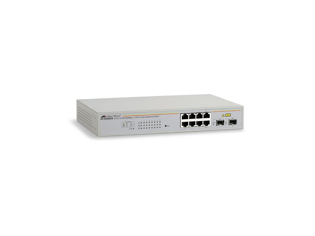The WebSmart AT-GS950/8 features a Web-based interface that allows you to set up 802.1Q VLANs to segregate traffic, QoS to prioritize mission-critical data such as voice or video packets, and link aggregation to create traffic pipelines. The AT-GS950/8 also provides network monitoring tools such as port mirroring and basic port statistics. Remote product management enables simple monitoring from anywhere you have connectivity. This WebSmart switch provides managed features for simple QoS applications, 8 10/100/1000T ports and two combo SFP ports for Gigabit connections.