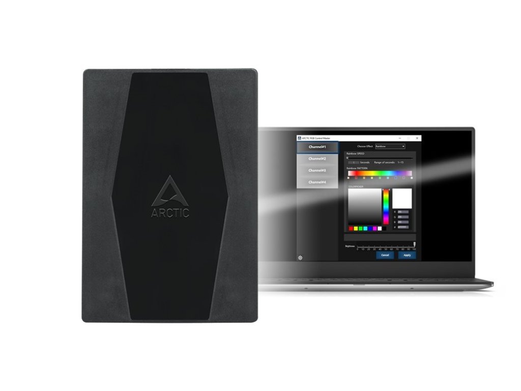 RGB ovladač je připojen k základní desce přes interní USB Header a ovládán RGB softwarem ARCTIC. Bez použití softwaru běží celé barevné spektrum sekvenčně.