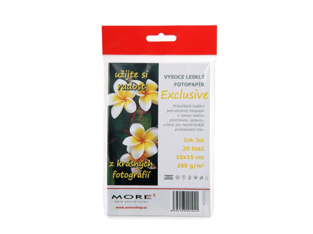 ARMOR Fotopapír MORE Exclusive je předurčen pro kvalitní i ten nejnáročnější tisk fotografií v inkoustových tiskárnách. Jedná se o jednostranně potahovaný fotopapír s vysoce lesklou povrchovou úpravou, díky které mají fotografie vždy vysoký kontrast při zachování přirozených barev.Balení obsahuje 20 listů formátu 10x15 cm gramáže 260 g/m^2.