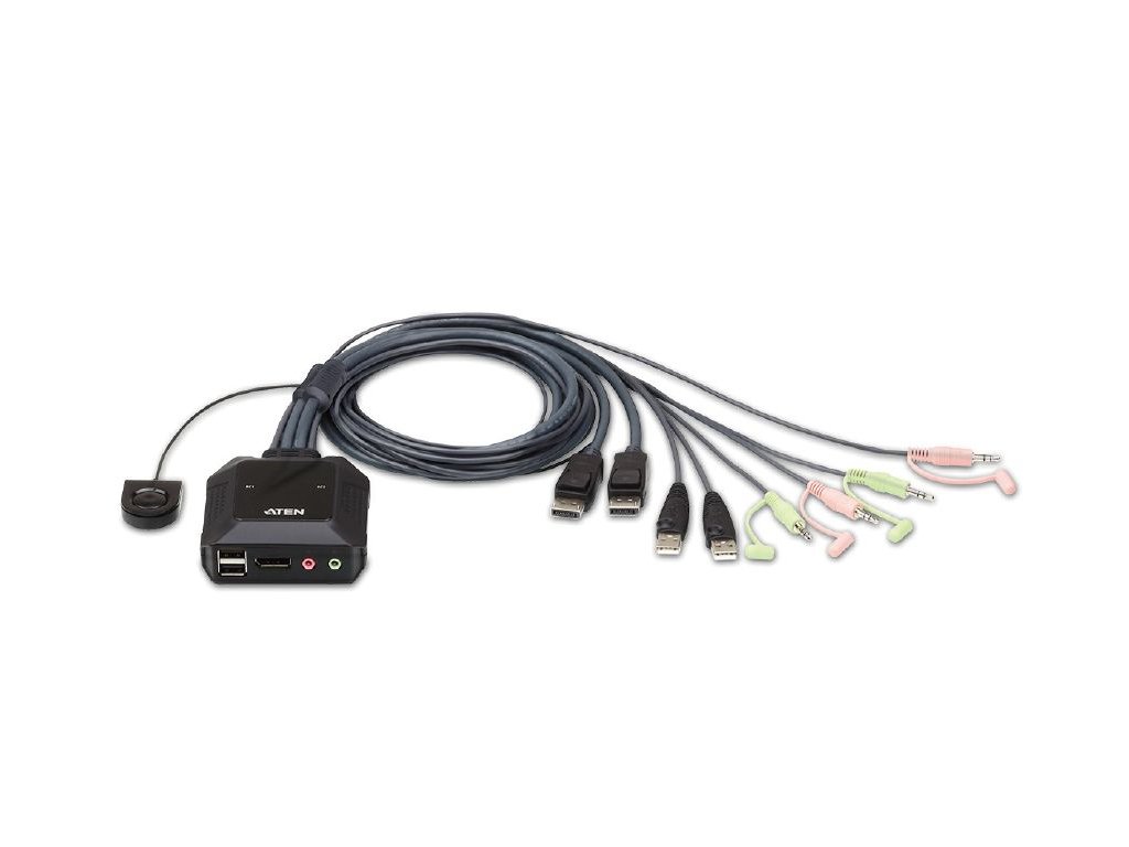 ATEN 2-port DisplayPort KVM s kabelovým přepínačem, audioCS-22DP 2-portový USB DisplayPort kabelový KVM přepínač je řídicí jednotka, která umožňuje přístup k dvěma počítačům z jedné konzole s USB klávesnicí a myší, DisplayPort monitorem a zvukem.