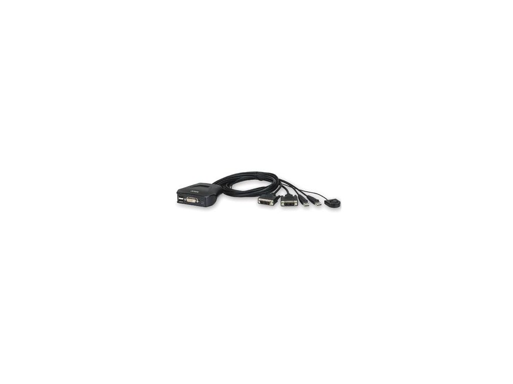 Aten 2-port DVI KVM USB mini, integrované kabely, tlačítko pro přepínáníJednoduchý KVM přepínač pro připojení dvou počítačů k jednomu monitoru DVI, klávesnici a myši USB. Napájeno z USB portu připojených počítačů.