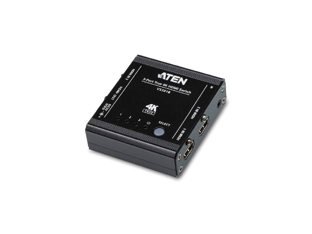 ATEN 3 port HDMI True 4K switch 3 - 1 HDMI, DO, kovové šasiPřepínač VS381B se 3 porty True 4K HDMI s automatickým přepínáním umožňuje přepnout 3 zdroje vstupu HDMI na displej HDMI. Podporuje rozlišení videa až True 4K (4096 x 2160 @ 60Hz 4: 4: 4), přenosové rychlosti až 18 Gb / s, HDR, 3D, Deep Color a HD.