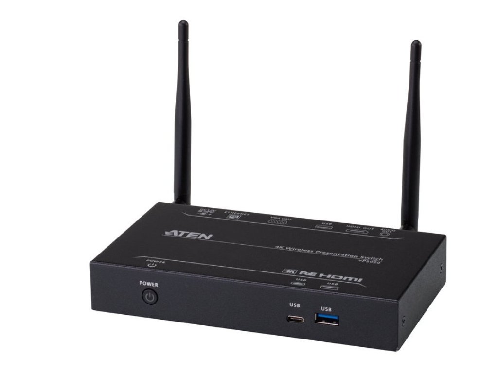 ATEN 4K Bezdrátový prezentační přepínačJako bezdrátové řešení BYOD je VP2020 prezentační přepínač 4K s modulem Wi-Fi a více přístupy pro nezbytnou konektivitu, kterou úspěšná schůzka vyžaduje. Umožňuje účastníkům vysílat obsah ve 4K na 1 displej s podporou HDMI a 1 displej s podporou VGA současně přes Wi-Fi z jejich notebooků