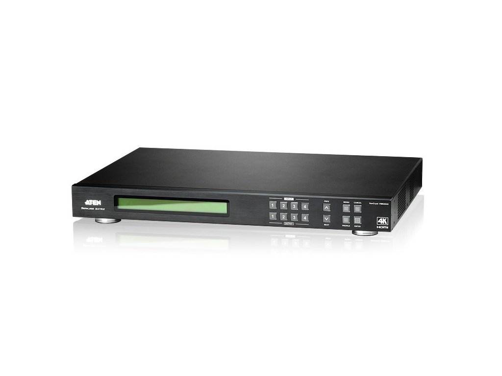ATEN 4x4 port HDMI matrix přepínač a scaler, 4K, HDMI 2.0Umožní připojit 4 HDMI zdroje k 4 HDMI zobrazovačům v jakékoliv kombinaci vstupů/výstupů v rozlišení až 4K. Vestavěný scaler pro zvýšení rozlišení obrazu a jeho kvality a přizpůsobení obrazu pro nativní rozlišení zobrazovací jednotky.