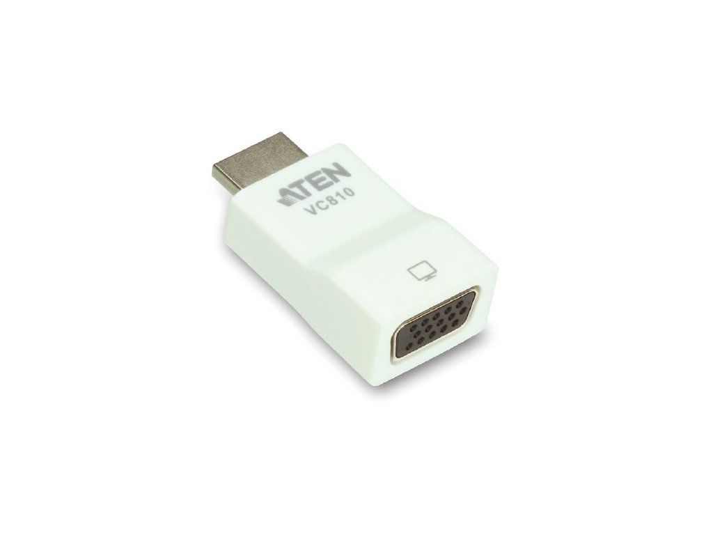 ATEN Konvertor HDMI na VGA rozhraní až 1080PPřevodník VC-810 převádí signál z HDMI zdroje signálu na VGA (pouze v tomto směru), takže umožní zobrazovat signál z digitálního zdroje HDMI na analogovém VGA monitoru, televizi.