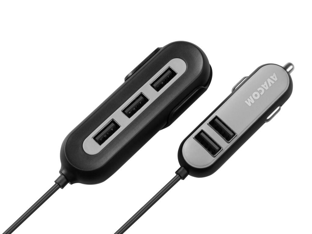 AVACOM CarHUB nabije 5 přístrojů současně. Má dvě části, které jsou spojené 1,5 m dlouhým kabelem. První část se dvěma USB výstupy lze zapojit do zásuvky autozapalovače. Další tři USB výstupy se dají pomocí praktického klipu připevnit za zadní sedadlo, což umožní nabíjení všem cestujícím v autě. Vysoký výstupní proud nabíječky (2,4 A na port a 10,8 A celkově) a výkon 54 W zaručují bezproblémové nabíjení náročných zařízení - smartphonů, tabletů nebo navigací.