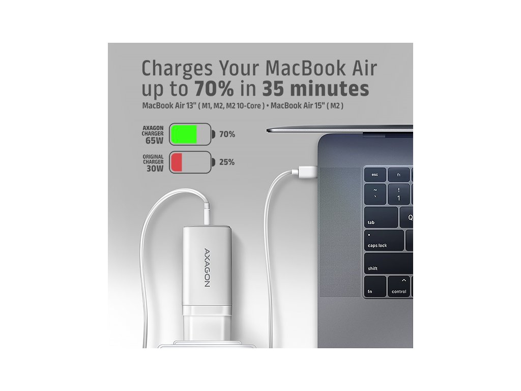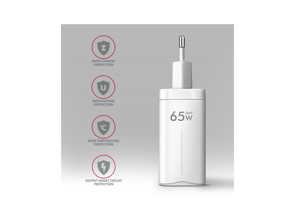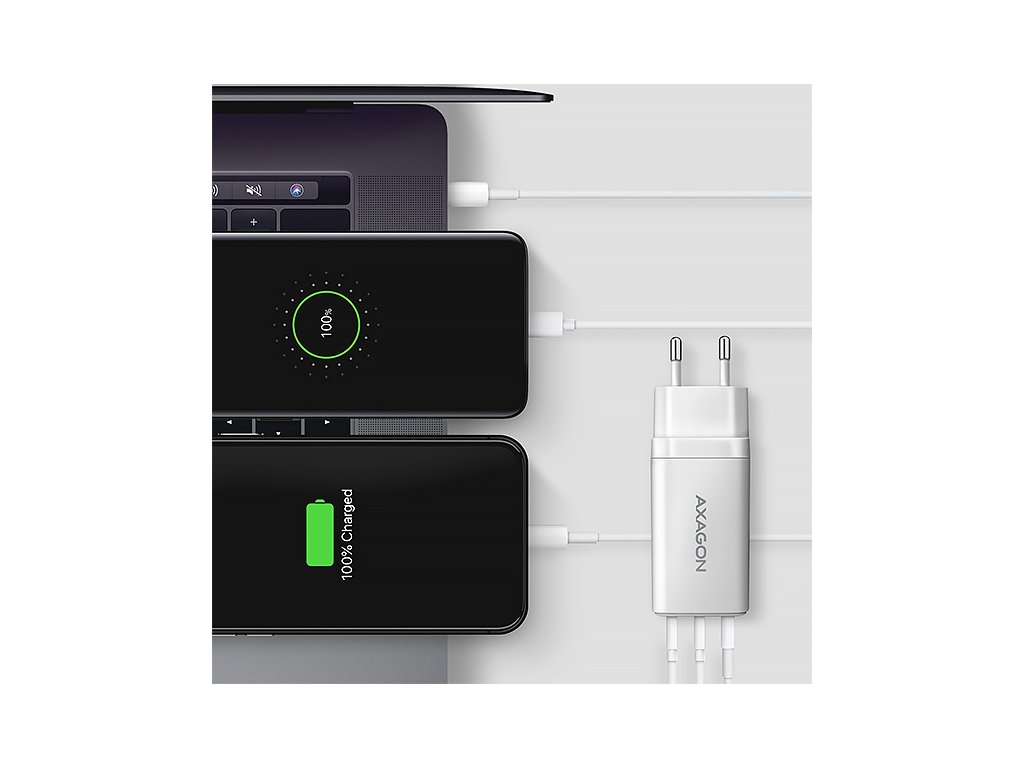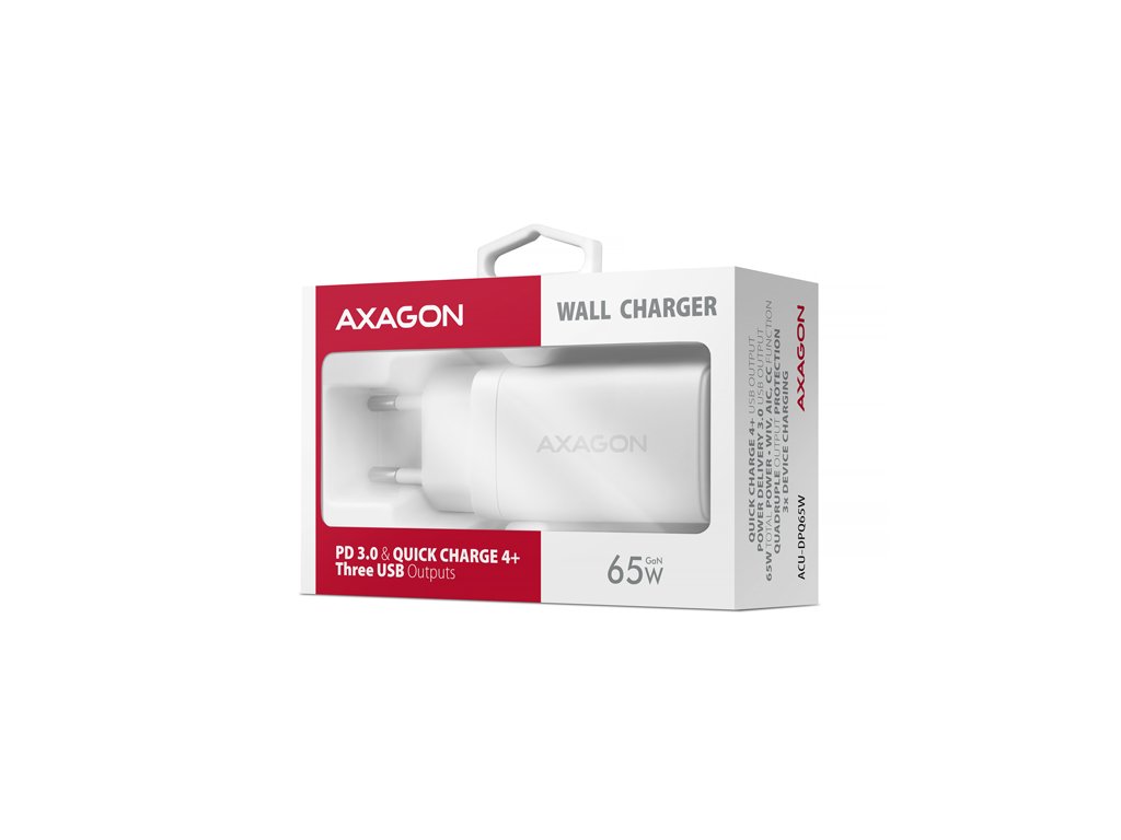 Cestovní nabíječka do sítě AXAGON ACU-DPQ65W GaN umožňuje rychlé nabíjení až tří mobilních zařízení současně. Díky celkovému výkonu 65W dokáže nabíječka dobíjet notebooky, telefony a další mobilní zařízení nejvyšší možnou rychlostí. Adaptér nabízí nejen standardní USB-A konektor, ale také dva oboustranné USB-C konektory.Kompaktní velikost a vysoký výkon je daný využitím nové GaN technologie. Použité součástky s Nitridem Galia pracují s vysokou účinností, což umožňuje dosahovat vysokých výkonů při malé velikosti. Nabíječka je vybavena dvěma výstupy Power Delivery 3.0 / Quick Charge 4+ USB typu C a jeden Quick Charge 3.0 USB typu A, což umožňuje rychlé nabíjení nejen smartphonů a tabletů, ale také notebooků.