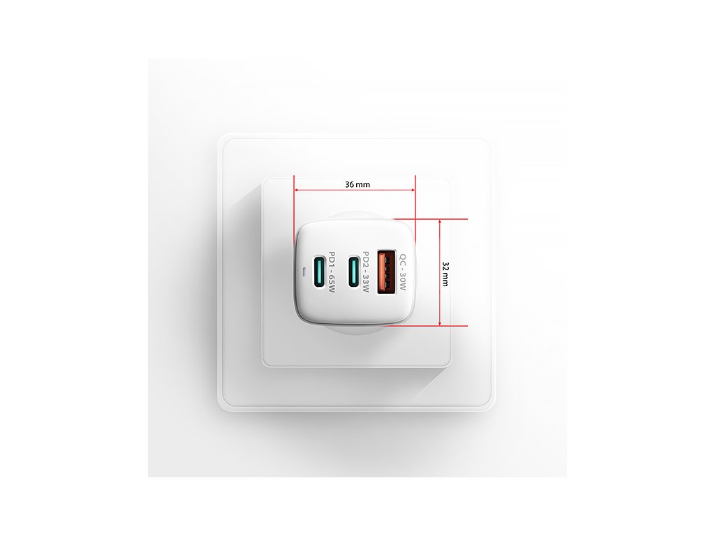 Tělo napájecího adaptéru má příjemný tvar a kompaktní velikost. Ve srovnání s klasickými nabíjecími adaptéry se stejnými parametry je velikost této nabíječky až o polovinu menší. Kombinace malých rozměrů, dosažených pomocí GaN technologie, a širokého rozsahu vstupního napětí, dělá z této nabíječky ideálního pomocníka na cesty. Provoz nabíječky signalizuje elegantní LED dioda.
