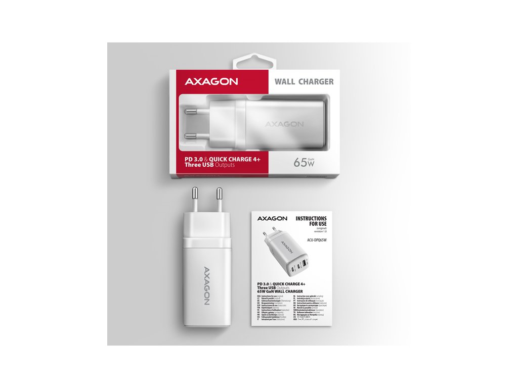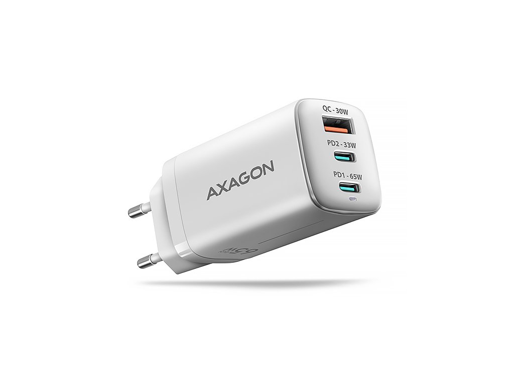 AXAGON ACU-DPQ65W, GaN nabíječka do sítě 65W, 3x port (USB-A + dual USB-C), PD3.0/QC4+/PPS/Apple