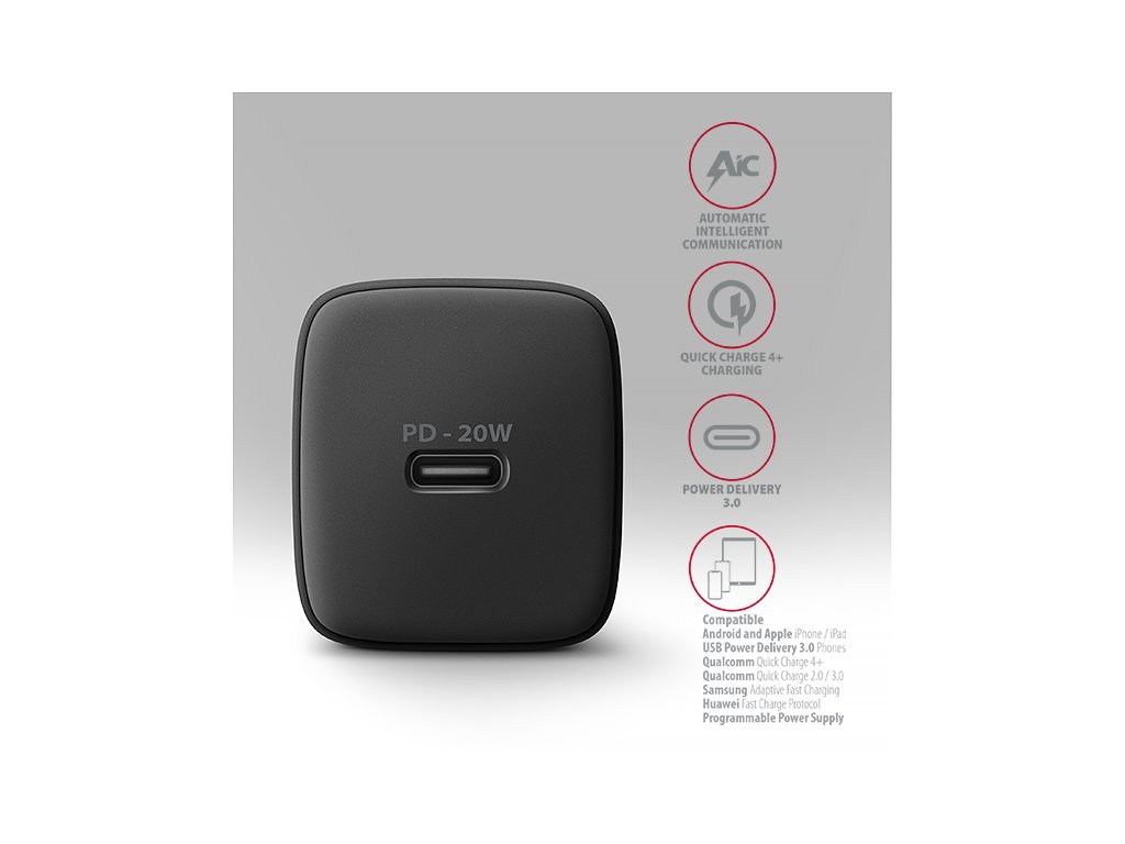 Kompaktní nabíječka do sítě AXAGON ACU-PD20 umožňuje rychlé nabíjení mobilních zařízení. Díky maximálnímu výkonu 20W dokáže nabíječka dobíjet telefony, tablety a další mobilní zařízení nejvyšší možnou rychlostí. Adaptér nabízí oboustranný USB-C konektor.Nabíječka je vybavena výstupem Power Delivery 3.0 / Quick Charge 4+ USB typu C, což umožňuje rychlé nabíjení smartphonů a tabletů výkonem až 20W.