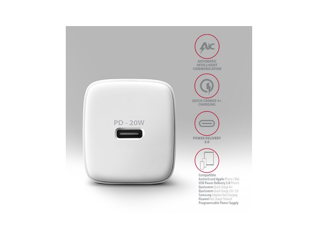 Kompaktní nabíječka do sítě AXAGON ACU-PD20W umožňuje rychlé nabíjení mobilních zařízení. Díky maximálnímu výkonu 20W dokáže nabíječka dobíjet telefony, tablety a další mobilní zařízení nejvyšší možnou rychlostí. Adaptér nabízí oboustranný USB-C konektor.Nabíječka je vybavena výstupem Power Delivery 3.0 / Quick Charge 4+ USB typu C, což umožňuje rychlé nabíjení smartphonů a tabletů výkonem až 20W.