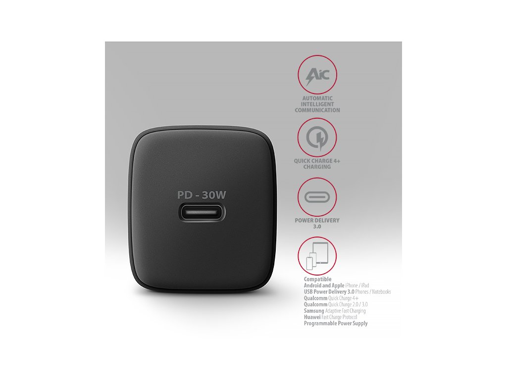 AXAGON ACU-PD30, Sil nabíječka do sítě 30W, 1x port USB-C, PD3.0/PPS/QC4+/SFC/AFC/Apple, černá