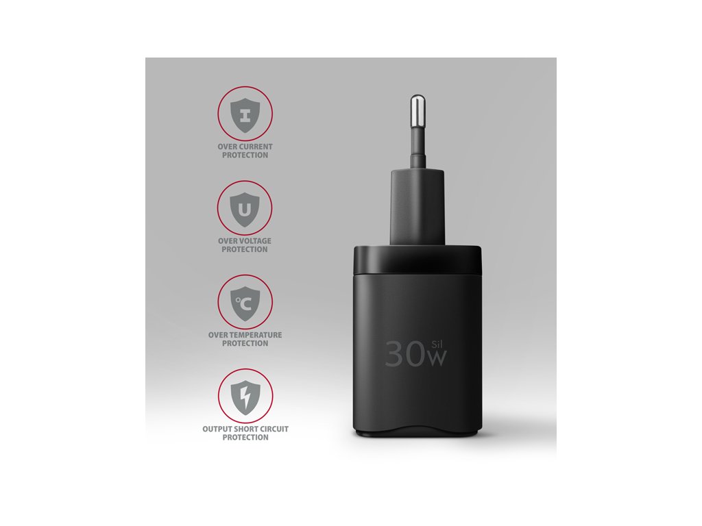 Kompaktní USB nabíječka do sítě AXAGON ACU-PQ30 Sil pro rychlé nabíjení až dvou mobilních zařízení současně. Díky celkovému výkonu 30W nabíječka dobíjí telefony, tablety a další mobilní zařízení nejvyšší možnou rychlostí. Adaptér nabízí nejen standardní USB-A konektor, ale také oboustranný USB-C konektor.Kompaktní velikost a vysoký výkon je daný použitou novou Sil technologií. Super silicon využívá vyspělé materiály na bázi křemíku. Nabíječka tak může dosáhnout menších rozměrů a současně bezpečného, stabilního a rychlého nabíjení. Účinnost je tak shodná s GaN technologií při zachování příznivé ceny. Nabíječka je vybavena výstupy Power Delivery 3.0 / Quick Charge 4+ USB typu C a Quick Charge 3.0 USB typu A, což umožňuje rychlé nabíjení smartphonů a tabletů výkonem až 30W.