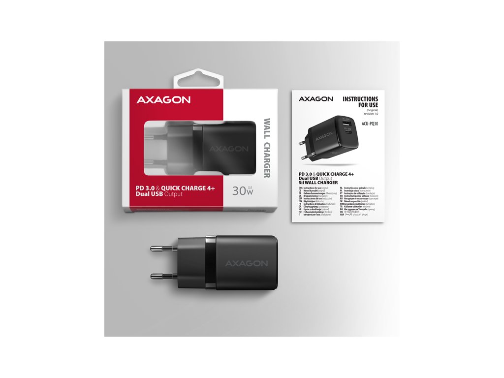 AXAGON ACU-PQ30, Sil nabíječka do sítě 30W, 2x port (USB-A + USB-C), PD3.0/PPS/QC4+/SFC/AFC/Apple