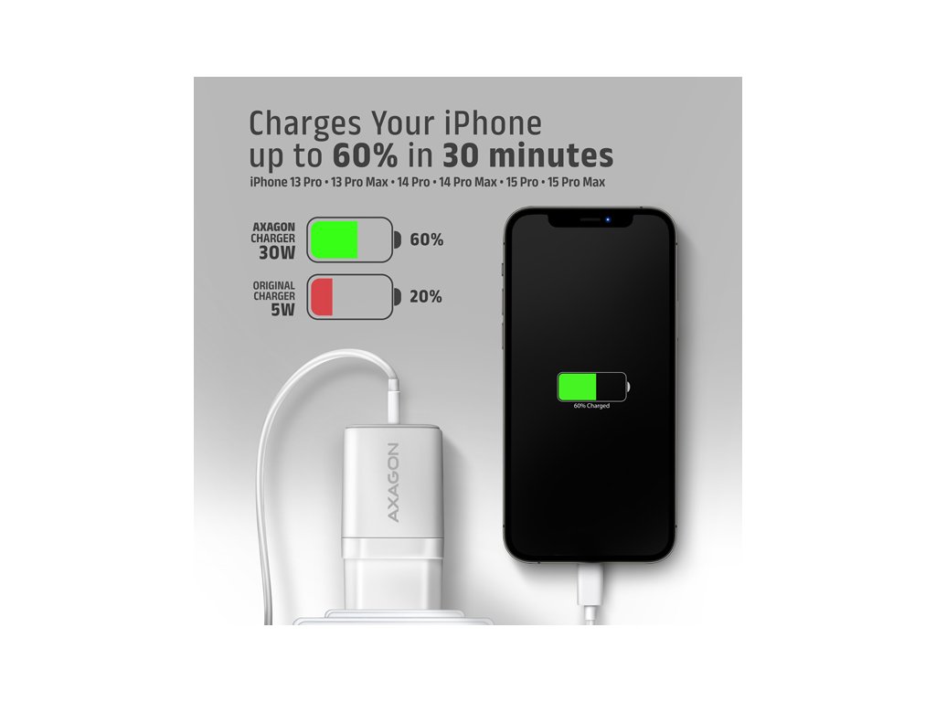 Kompaktní USB nabíječka do sítě AXAGON ACU-PQ30W Sil pro rychlé nabíjení až dvou mobilních zařízení současně. Díky celkovému výkonu 30W nabíječka dobíjí telefony, tablety a další mobilní zařízení nejvyšší možnou rychlostí. Adaptér nabízí nejen standardní USB-A konektor, ale také oboustranný USB-C konektor.Kompaktní velikost a vysoký výkon je daný použitou novou Sil technologií. Super silicon využívá vyspělé materiály na bázi křemíku. Nabíječka tak může dosáhnout menších rozměrů a současně bezpečného, stabilního a rychlého nabíjení. Účinnost je tak shodná s GaN technologií při zachování příznivé ceny. Nabíječka je vybavena výstupy Power Delivery 3.0 / Quick Charge 4+ USB typu C a Quick Charge 3.0 USB typu A, což umožňuje rychlé nabíjení smartphonů a tabletů výkonem až 30W.