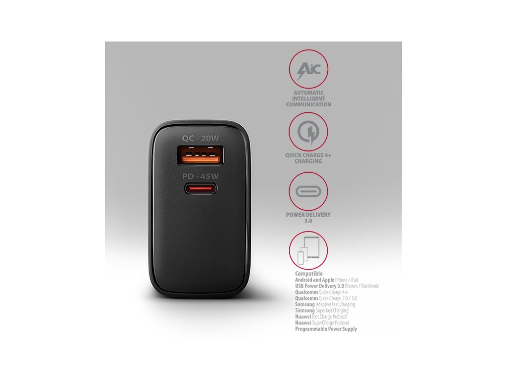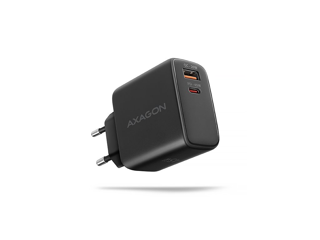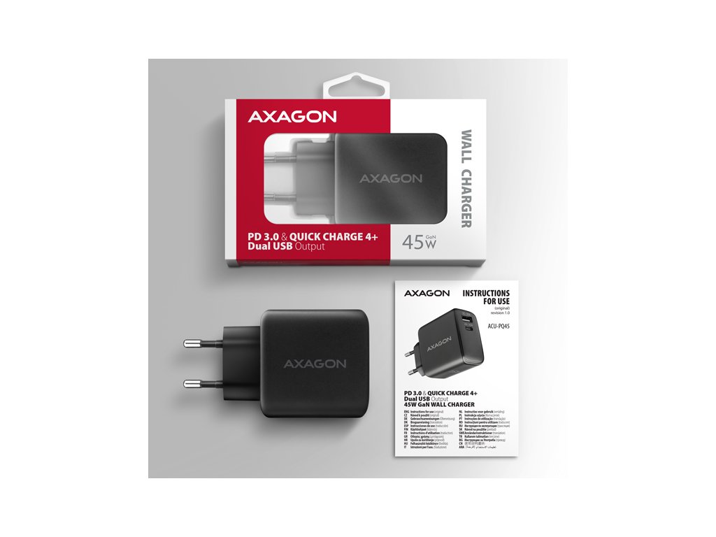 Cestovní nabíječka do sítě AXAGON ACU-PQ45 GaN umožňuje rychlé nabíjení až dvou mobilních zařízení současně. Díky celkovému výkonu 45W dokáže nabíječka dobíjet telefony, tablety a další mobilní zařízení nejvyšší možnou rychlostí. Adaptér nabízí nejen standardní USB-A konektor, ale také oboustranný USB-C konektor.Kompaktní velikost a vysoký výkon je daný využitím nové GaN technologie. Použité součástky s Nitridem Galia pracují s vysokou účinností, což umožňuje dosahovat vysokých výkonů při malé velikosti. Nabíječka je vybavena výstupy Power Delivery 3.0 / Quick Charge 4+ USB typu C a Quick Charge 3.0 USB typu A, což umožňuje rychlé nabíjení nejen smartphonů a tabletů, ale také malých notebooků výkonem až 45W.