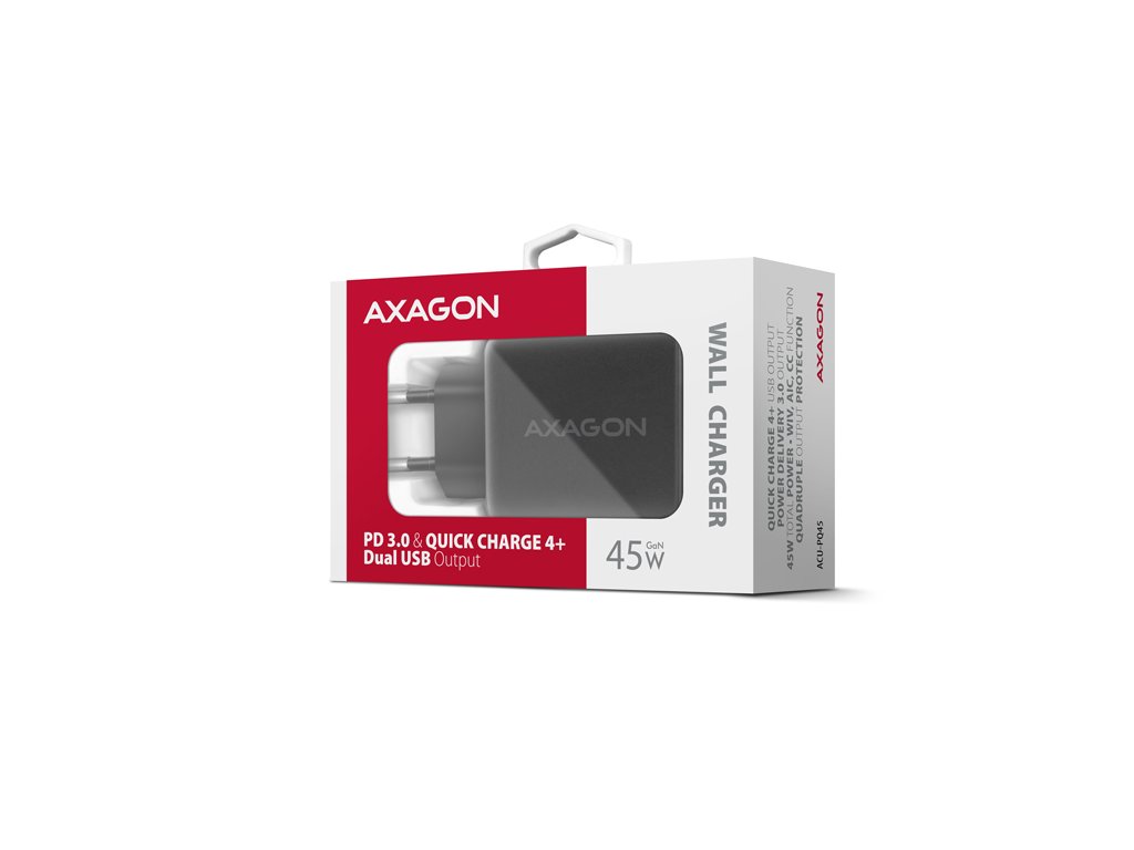 AXAGON ACU-PQ45 GaN nabíječka do sítě 45W, 2x port (USB-A + USB-C), PD3.0/PPS/QC4+/SFC 2.0/AFC/Apple