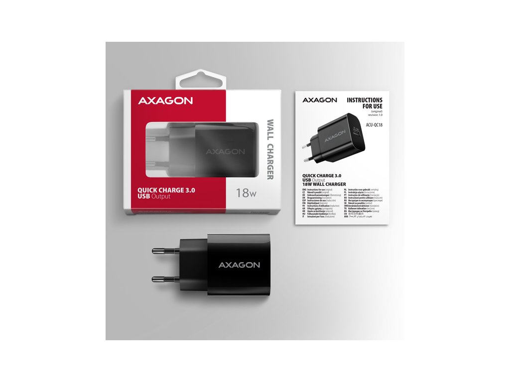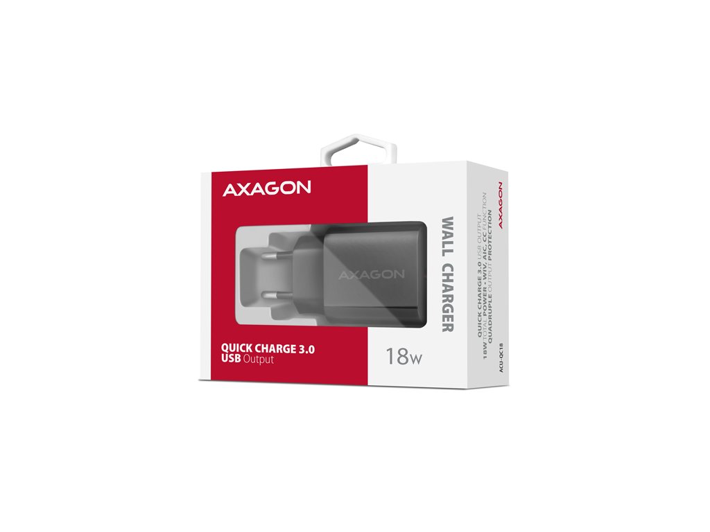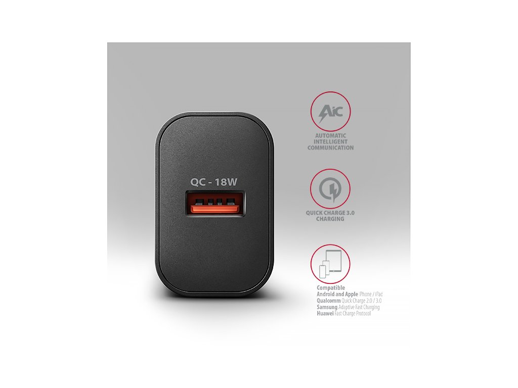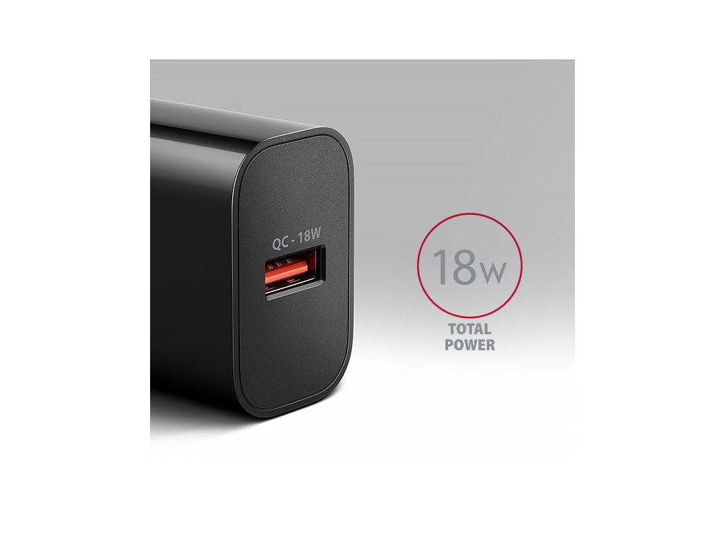 USB nabíječka do sítě AXAGON ACU-QC18 je určena pro nabíjení mobilních zařízení. Díky maximálnímu výkonu 18W dokáže nabíječka dobíjet telefony, tablety a další mobilní zařízení nejvyšší možnou rychlostí. Adaptér nabízí standardní USB-A konektor.Nabíječka je vybavena výstupem Quick Charge 3.0 USB typu A, což umožňuje rychlé nabíjení smartphonů a tabletů výkonem až 18W. Adaptér je také kompatibilní s dalšími standardy rychlého nabíjení telefonů, jako jsou Apple iPhone, iPad, Samsung, Huawei, Honor, Xiaomi, Motorola a dalších.