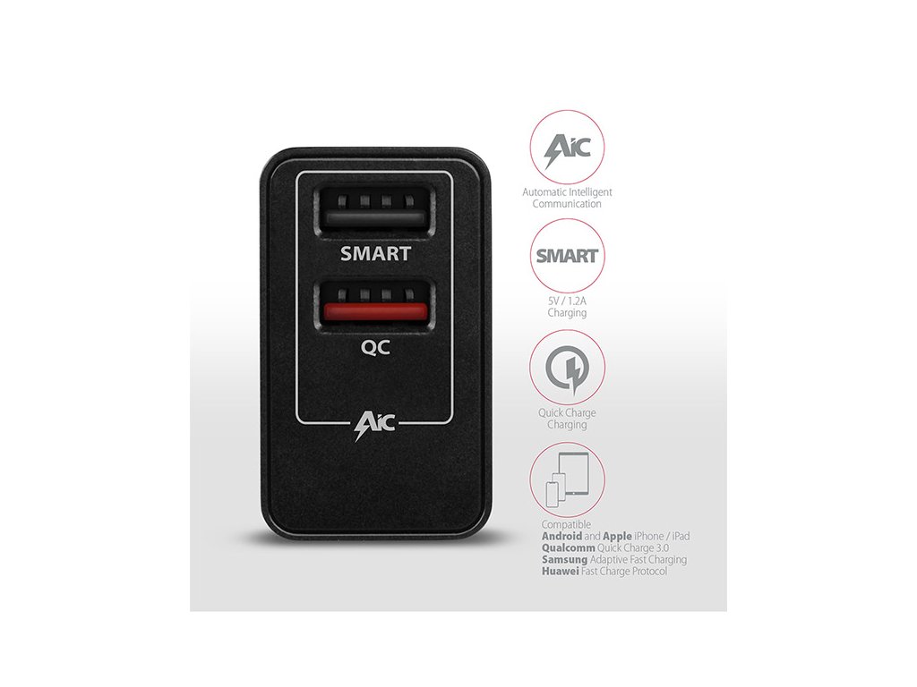 Funkce AIC rozpozná připojené zařízení a automaticky zvolí optimální rychlost nabíjení, funkce CC zajistí stabilní průběh nabíjení.