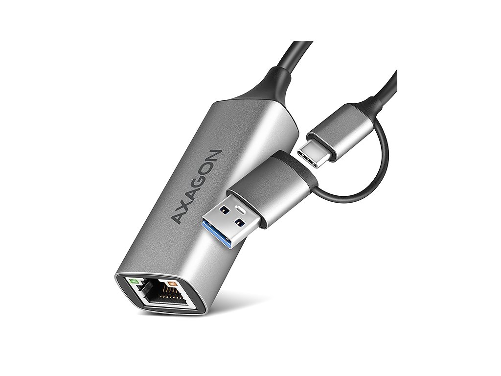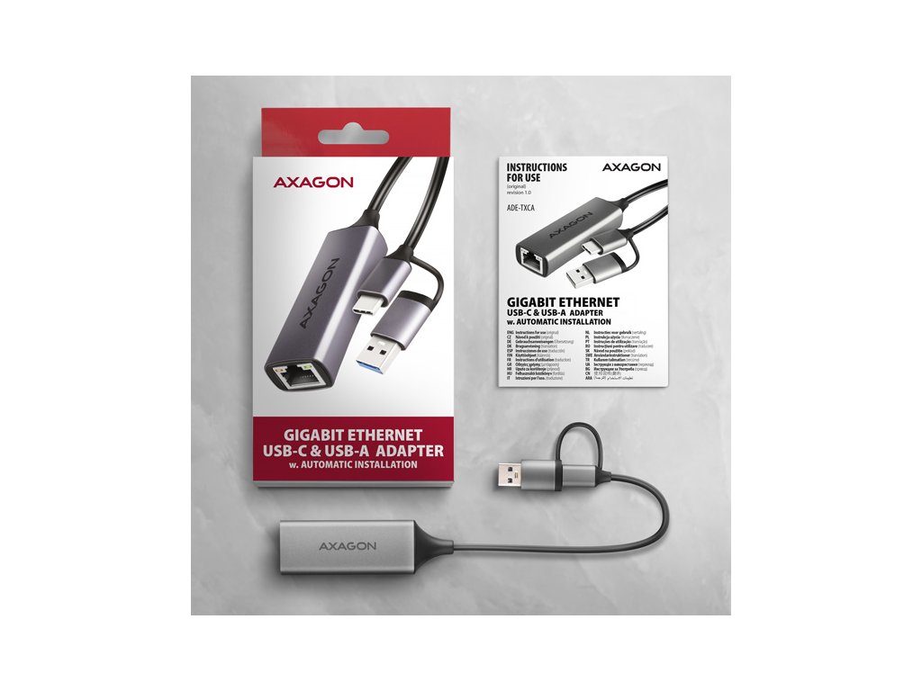 AXAGON ADE-TXCA, USB-C + USB-A 3.2 Gen 1 - Gigabit Ethernet síťová karta, Asix AX88179, auto instal