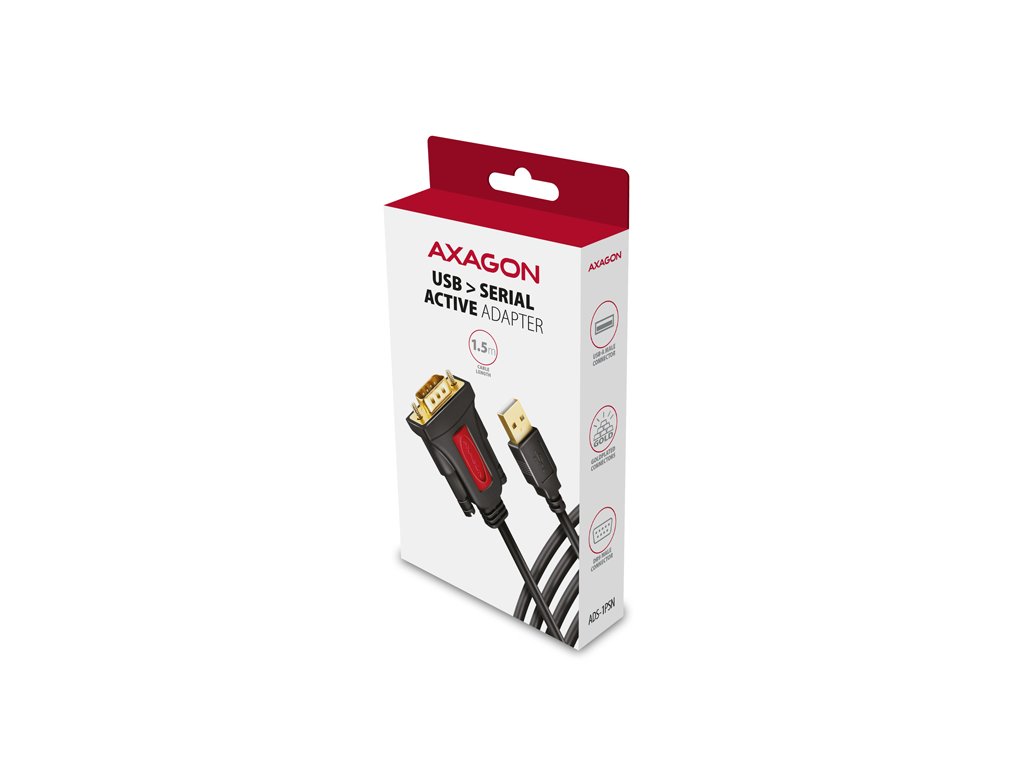Aktivní USB převodník AXAGON ADS-1PSN snadno rozšíří počítač o sériový port standardu RS 232. Bezproblémová kompatibilita USB - serial RS232 adaptéru je dána použitím originálního čipu tchajwanské společnosti Prolific.Napevno uchycený 1.5 m dlouhý USB-A kabel je vhodný pro použití jak se stolním počítačem, tak i notebookem. Kabel je opatřen pozlacenými konektory a kontakty, velmi odolné tělo adaptéru je vhodné i do průmyslových aplikací. Dvojité stínění chrání přenášené signály před nepříznivým rušením.