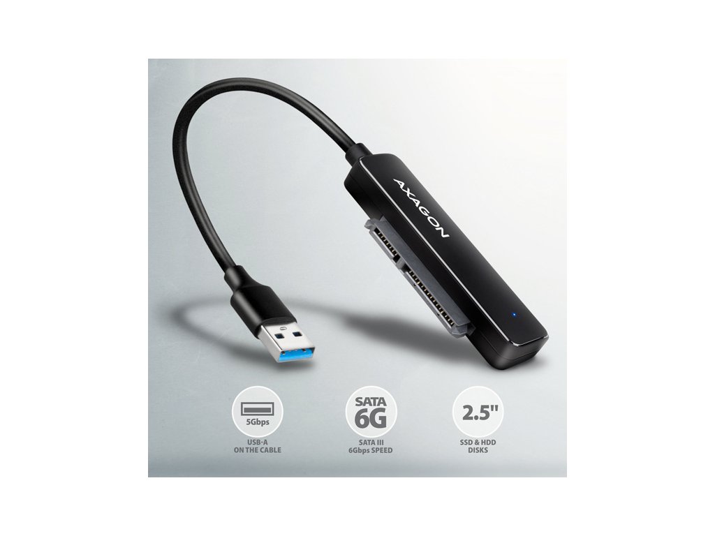 • USB-A - SATA adaptér s kabelem napevno délky 20 cm,