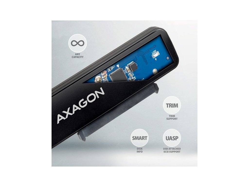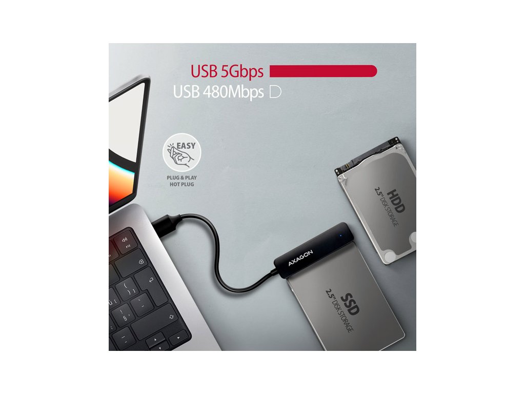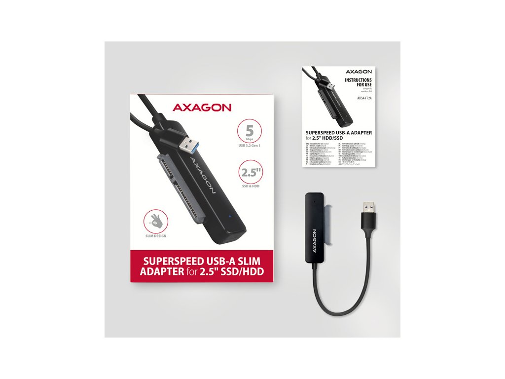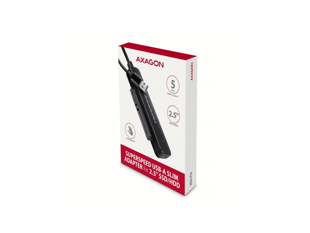 Kompaktní AXAGON ADSA-FP2A SLIM adaptér s USB-A 5Gbps a SATA 6G rozhraním určený pro 2.5" SATA pevné disky nebo SSD. Připojení k počítači umožňuje napevno uchycený USB-A kabel délky 20 cm. Díky rozhraní USB 3.2 Gen 1 je přenosová rychlost až 5 Gb/s, funkce Plug & Play zajistí automatické připojení k počítači.Adaptér také podporuje všechny důležité funkce pro bezproblémovou práci s různými typy disků. Jsou to UASP pro rychlejší přenos dat, TRIM pro omezení pozvolné degradace výkonu SSD v čase, S.M.A.R.T. pro monitoring stavu disků, BOOT pro možnost bootování z disků připojených k adaptéru, Auto Spindown pro automatické uspání disků při delší nečinnosti, Turn Off pro vypnutí disků po odebrání zařízení nebo uspání PC a USB Bus Power pro napájení adaptéru včetně připojeného disku jen z USB sběrnice.