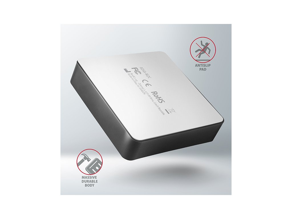Robustní tělo stanice je vyrobeno z hliníku v moderním designu. Nízko položené těžiště dokovací stanice zajišťuje dobrou stabilitu. Gumové nožky omezují posouvání po stole.