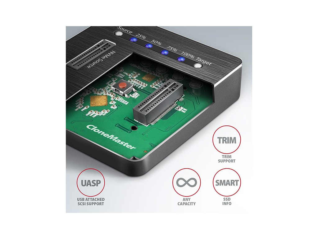 Dokovací stanici také využijete pro snadné klonování obsahu připojených NVMe disků bez potřeby připojení k PC. Do prvního slotu stanice (source) zasunete zdrojový M.2 disk a do druhého slotu (target) zasunete cílový M.2 disk. Pak jen zmáčknete klonovací tlačítko a sledujete průběh klonování na stupnici ze čtyř LED diod. Po zkopírování všech dat je na cílovém disku přesná kopie původního M.2 disku. Dock tak lze využít jako autonomní zařízení pro pohodlné duplikování a vytváření obrazů disků. Jedná se o nejjednodušší způsob, jak přenést obsah jednoho SSD disku na další SSD disk, a to včetně funkčního operačního systému (Windows, macOS, Linux …).