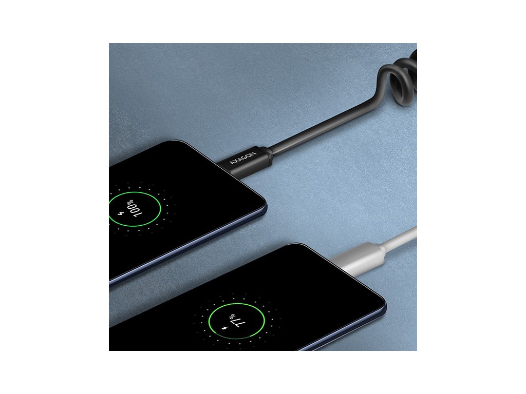 Kroucený propojovací USB-C <-> USB-A datový a nabíjecí AXAGON BUCM-AM20TB TWISTER USB 2.0 kabel s konektory USB-C male a USB-A male. Kabel je navržen pro synchronizaci dat a nabíjení telefonů, tabletů a dalších mobilních zařízení. Kabel podporuje přenos dat rychlostí až 480 Mb/s, je kompatibilní s nabíjecími technologiemi Quick Charge, Samsung AFC, Huawei FCP, SMART a dalšími. Připojené zařízení lze nabíjet proudem až 3A.Odolný datový a napájecí kabel s prodlouženou životností je opatřen kovovými koncovkami, konektory s poniklovaným povrchem a pozlacenými kontakty. Vodiče kabelu jsou vyrobené z pocínované bezkyslíkaté mědi. Kvalitní izolace kabelu, vyrobená z flexibilního TPE, zaručuje maximální odolnost, ale zachovává i dostatečnou ohebnost. Díky kroucenému a natahovacímu provedení kabel zabírá minimum místa a je tak ideálním doplňkem do auta. Ve zkráceném stavu je kabel dlouhý jen 50 cm a nikde nepřekáží. V nataženém stavu pohodlně dosáhne 110 cm daleko od zásuvky.