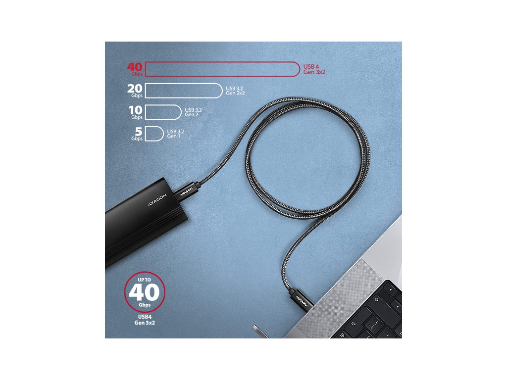 Prémiový propojovací USB-C <-> USB-C datový a nabíjecí AXAGON BUCM4X-CM05AB NewGEN+ kabel s konektory USB-C male na obou koncích. Kabel má plnohodnotné (Full-featured) zapojení podle specifikace USB 40Gbps (USB4 Gen 3x2) a je plně kompatibilní se specifikací Thunderbolt 3 a Thunderbolt 4. Je navržen pro nejrychlejší datové přenosy, přenos videa a nabíjení notebooků, telefonů, tabletů. Umožňuje připojení monitorů, dokovacích stanic a externích SSD disků.Kabel podporuje přenos dat rychlostí až 40 Gb/s, také umožňuje přenášet obraz až do rozlišení 8K/60Hz Full Ultra HD a zvuk.