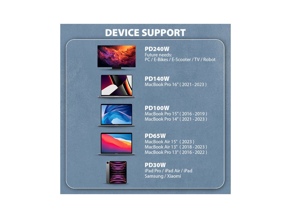 • Podporované technologie nabíjení: Power Delivery 2.0 / 3.0 / 3.1 240W (48V/5A), Qualcomm Quick Charge 2.0 / 3.0 / 4+, Samsung Adaptive Fast Charging, Huawei Fast Charge Protocol, SMART Charging a další.