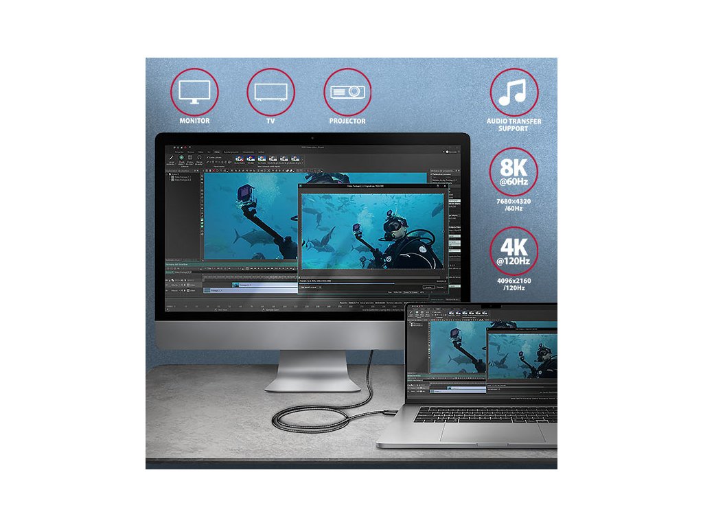 • Podpora protokolu DisplayPort 1.4a, 2.0 pro přenos zvuku a videa až do rozlišení Full Ultra HD 8K@60Hz, HDR10 - je nutný USB-C port s podporou DisplayPort Alternate Mode (DP Alt Mode) nebo Thunderbolt 3/4 port.
