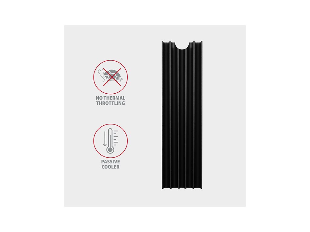 Pasivní chladič AXAGON CLR-M2L10 ALU pro ideální chlazení výkonných M.2 SSD disků, zejména NVMe. Univerzální heatsink lze použít na M.2 karty o rozměru 22 x 80 mm. Dvě dodávané teplovodivé podložky umožní montáž chladiče pro všechny jednostranné i oboustranné M.2 SSD disky.Žebrovaný hliníkový chladič vysoký 10 mm napomáhá lepšímu odvodu tepla vzniklého při provozu M.2 SSD disku a umožňuje tak snížit teplotu disku až o 25 °C. Prodlužuje se tak životnost SSD disku a zamezí se zpomalování rychlosti disku tzv. „Thermal Throttling“.