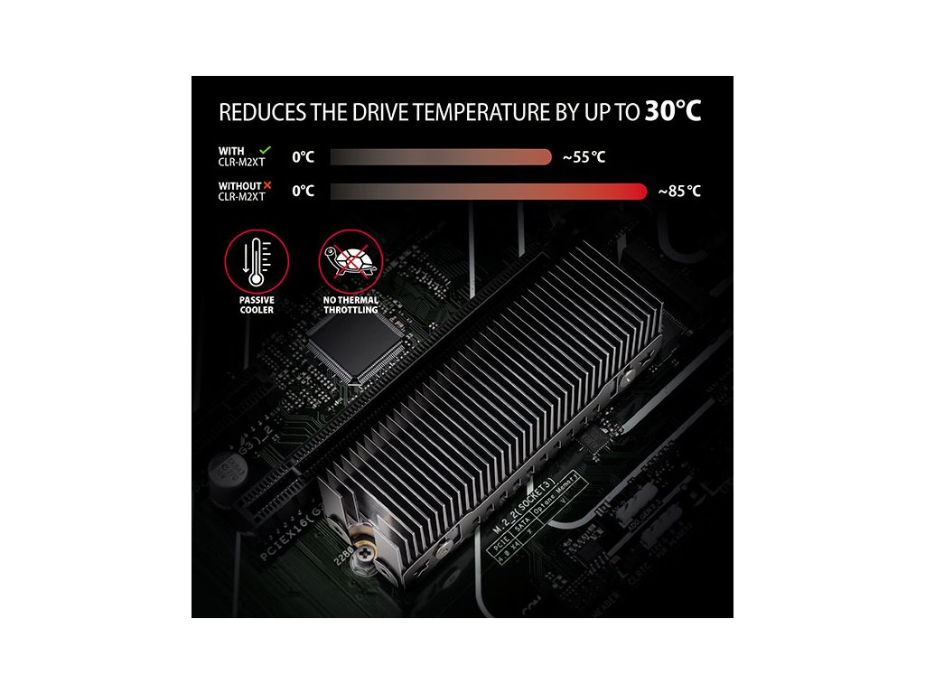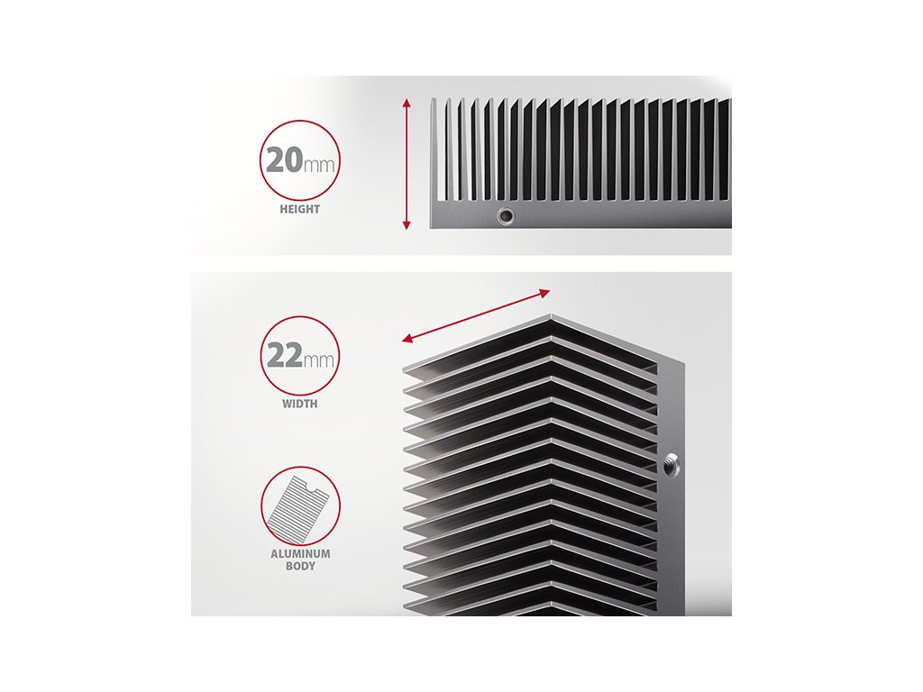 AXAGON CLR-M2XT ALU je pasivní hliníkový chladič určený pro intenzivní chlazení výkonných NVMe M.2 SSD disků. Univerzální heatsink lze použít pro M.2 karty o rozměru 22 x 80 mm. Dodávané teplovodivé podložky, umožní montáž chladiče pro všechny jednostranné i oboustranné M.2 SSD disky.Díky své celkové výšce 24 mm a pasivu o výšce 20 mm, lze chladič umístit i do skříně s omezeným prostorem. Příčné žebrování hliníkového pasivu a kovový rámeček optimalizují odvod tepla z M.2 SSD disku, což může snížit teplotu disku až o 30 °C. Tím se prodlužuje životnost SSD disku a zabraňuje se zpomalení rychlosti disku, tzv. “Thermal Throttling”.